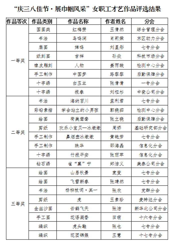 2022年3月8日—18日,手工艺作品展得到广大女职工的积极响应及热情参与,共收到书画类、编织类、刺绣类、手工制作类等各种手工艺作品近300件,作品内容丰富、形式多样、格调高雅、独具匠心,所工会经过一系列严密的准备工作,分别在综合办公楼一楼大厅和职工活动中心进行了展出,活动现场,巧夺天工的书法绘画,绣工精美的十字绣,制作精细的手贴画,还有形象逼真、惟妙惟肖的编织作品引得众人驻足观看,纷纷拿起手机拍照留念。展出接近尾声经评委根据作品类别评选出一等奖8名,二等奖8名,三等奖8名(获奖名单附后),其他参展作品均为纪念奖。所工会将为获奖作品及参展作品颁发精美的奖品、纪念品。作品展示了十三所女职工奇思妙想的聪明才智和妙手生花的艺术才华,更展现了她们热爱生活、向往美好未来的时代精神风貌。