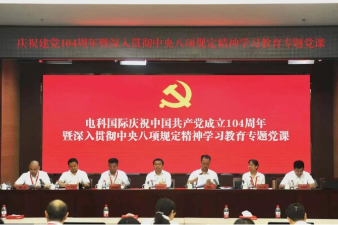 7月9日,电科国际召开庆祝中国共产党成立104周年大会,中国电科党组成员、副总经理兼电科国际党委书记、董事长孙迎新讲授深入贯彻中央八项规定精神学习教育专题党课,深入学习贯彻习近平总书记重要讲话精神,贯彻落实习近平总书记关于加强党的作风建设的重要论述,推动学习教育在国际化经营领域走深走实,切实筑牢思想根基,凝聚全体党员力量,推动各项工作迈向新高度。集团公司党建工作第一指导组组长曾耘等到会指导。公司党委副书记、总经理田耀斌主持会议。公司领导班子成员、中层及以上干部、全体党员参加会议,海外常驻及出差党员通过线上形式参会。