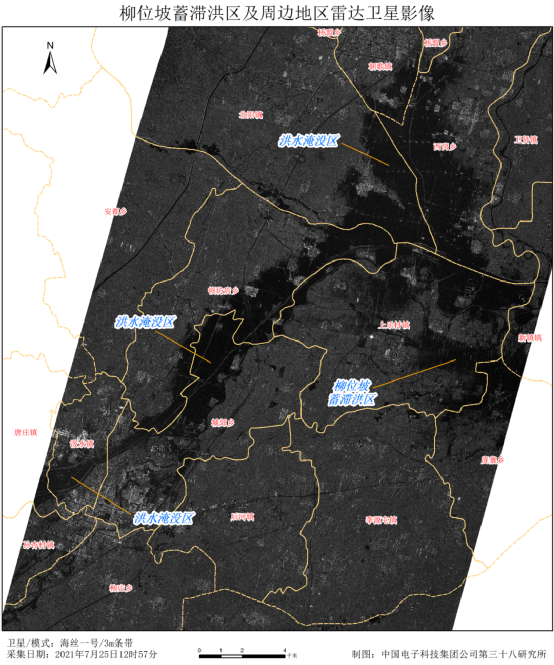 电科莱斯高分中心积极协调国家卫星中心和商业卫星合作伙伴,采用雷达遥感卫星多次对郑州市区实施拍摄,利用雷达遥感的技术优势,克服暴雨等不利气象条件,穿透积雨云开展成像。根据雷达影像分析暴雨淹没范围、受灾程度,支撑抗洪救灾工作。