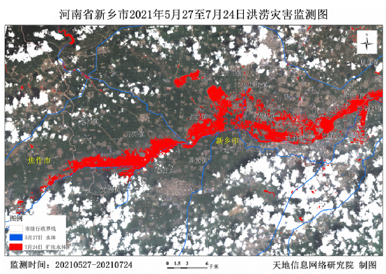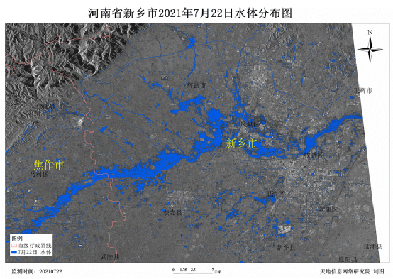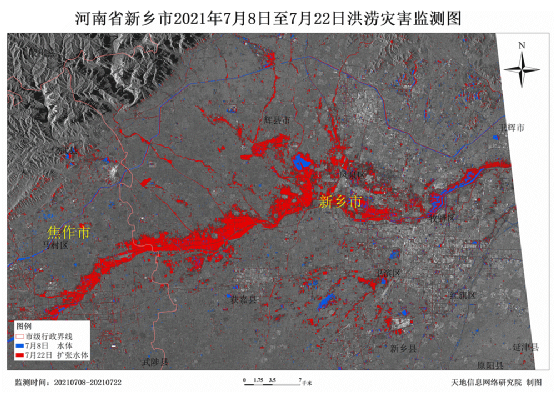 为尽快掌握新乡市受灾情况,天地信息网络研究院第一时间分析了2021年7月24日(GF1 WFV)、7月22日(GF3 SAR)、7月8日(Sentinel-1 SAR)和5月27日( Sentinel-2 2A)共四期遥感影像,全面监测新乡市洪水灾情,服务于地方防汛救灾工作。