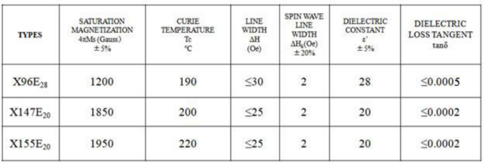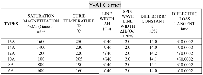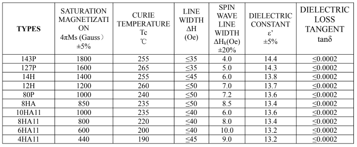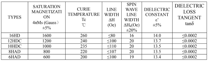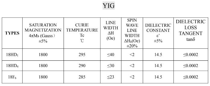 1. 特性:自旋波线宽大、温度系数低、居里温度高