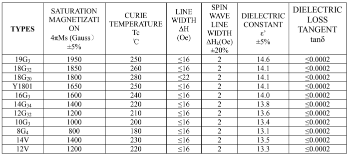 1. 特性:材料的铁磁共振线宽小、损耗低
