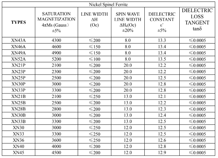 石榴石多晶铁氧体材料按掺杂的性质,分为 A、DA、G、P、HD、HA 等系列。尖晶石多晶铁氧体材料按主要成分的性质,分为 Ni 系和 Li 系两大系列。每一系列产品又有其不同的特性,为了帮助用户更好的了解和合理选用我所生产的微波铁氧体材料,特提出一下几点建议: