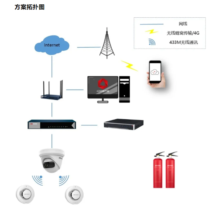❶ 尽可能早地发现火情; ❷ 发生火情后,能快速通知相关人员及时灭火; ❸ 有足够的灭火设备,易获取且能快速对早期火灾进行处理; ❹ 对于中小型仓库、商铺等场景,方案要更具针对性,在安全布防的同时,也要考虑经济成本,既能够部署消防,又能经济实惠。 二、方案拓扑图
