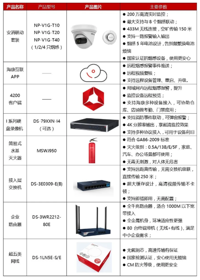 四、方案特色 1、多重报警、及时提醒、覆盖范围大 安消联动摄像机本身为常用200万高清监控配置,可做仓库、门店日常监控使用。 具有网关功能,可联动最大8台烟感探测器,一旦发生烟雾报警,就能通过摄像机确定火点位置,及时处理。